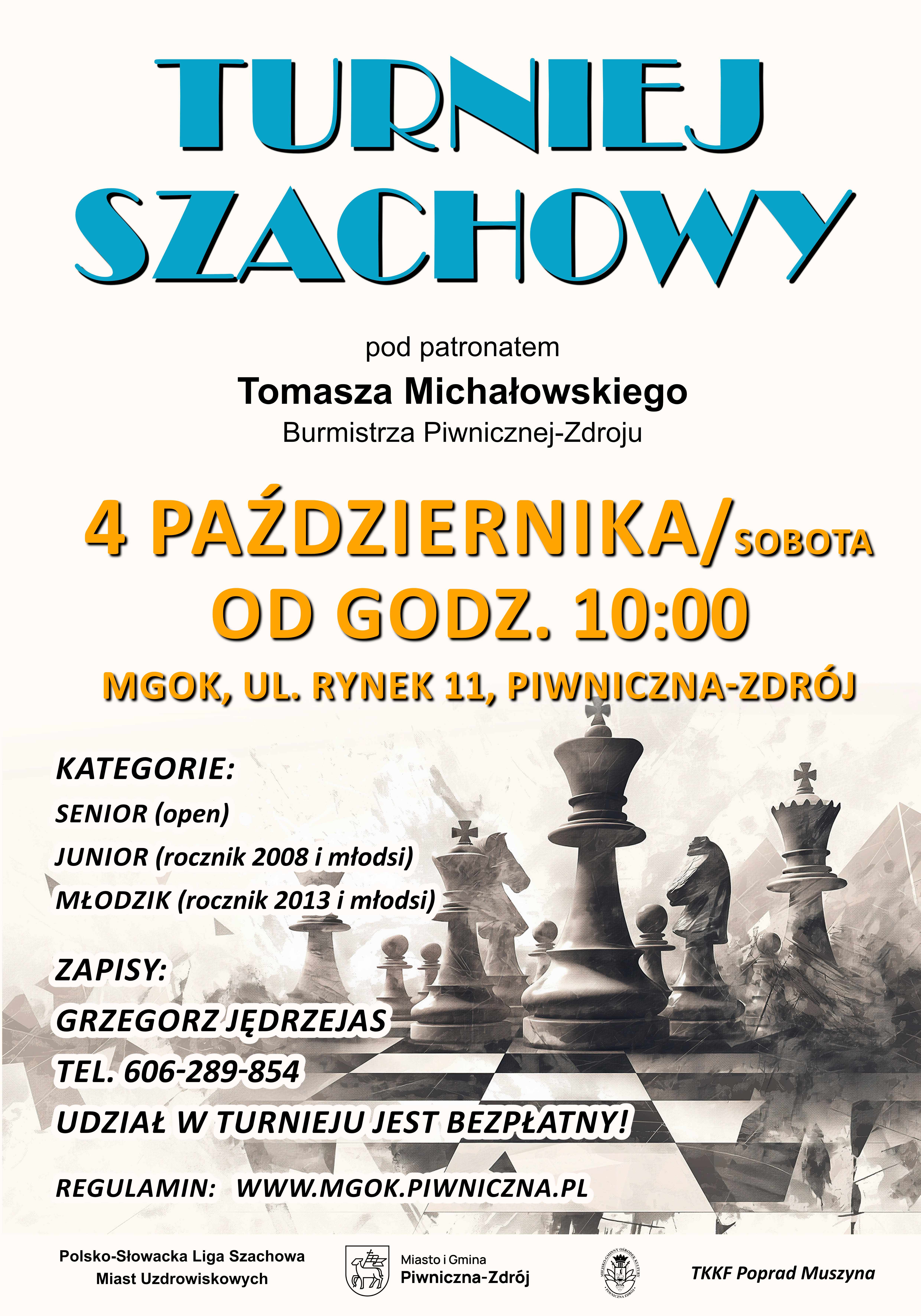 Zachęcamy do udziału w Turnieju Szachowym pod patronatem Tomasza Michałowskiego - Burmistrza Piwnicznej-Zdroju, który odbędzie się 4 października 2025 roku od godziny 10:00 w siedzibie MGOK w Piwnicznej-Zdroju (Rynek 11). Szczegóły oraz Regulamin poniżej.